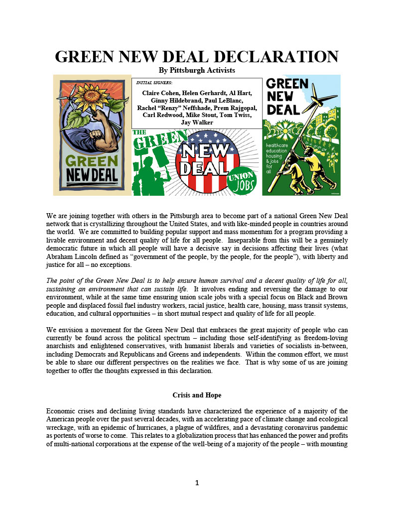 For a more comprehensive explanation of Pittsburgh Green New Deal principles, goals, strategies, and tactics, please see the original founding document, the Green New Deal Declaration, by clicking on the image of the first page below.